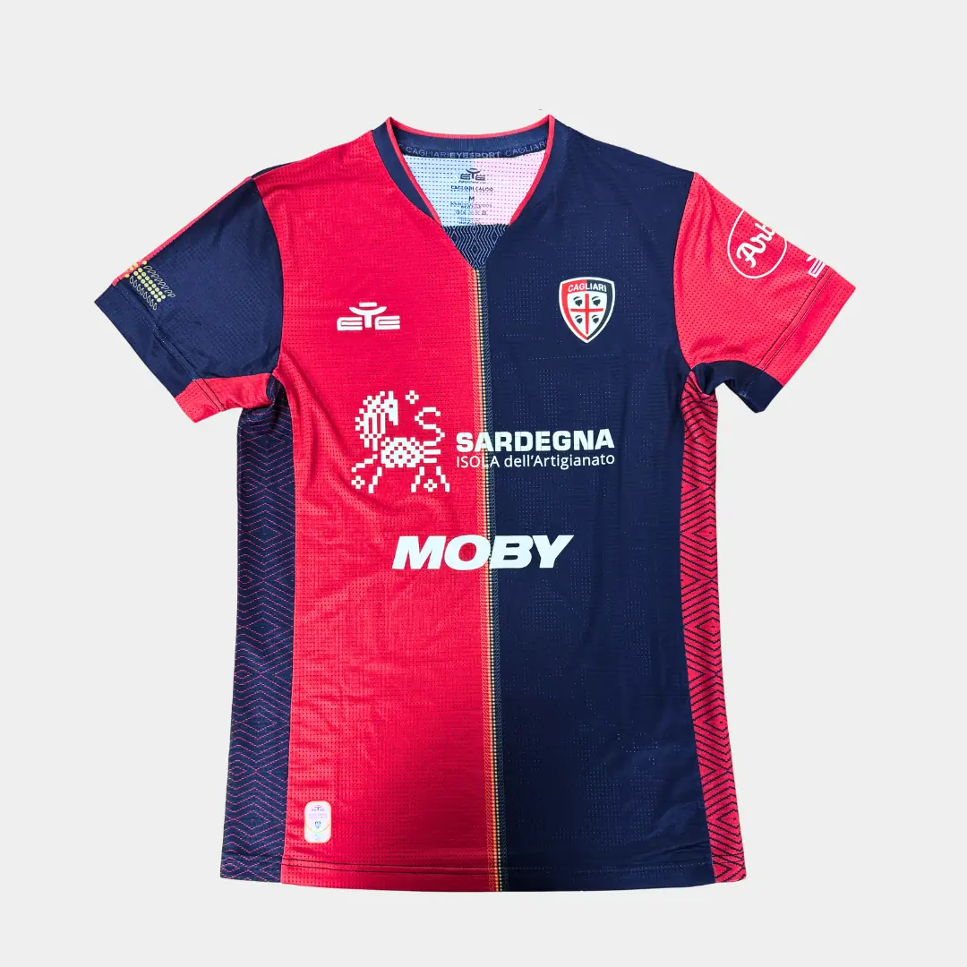 Oryginalna koszulka domowa Cagliari Calcio z sezonu 2024/25, zaprojektowana przez markę Eye Sport. To klasyczna odsłona trykotu sardyńskiego klubu, łącząca charakterystyczny podział na czerwono-granatowe barwy z nowoczesnym krojem i detalami podkreślającymi tożsamość regionu.