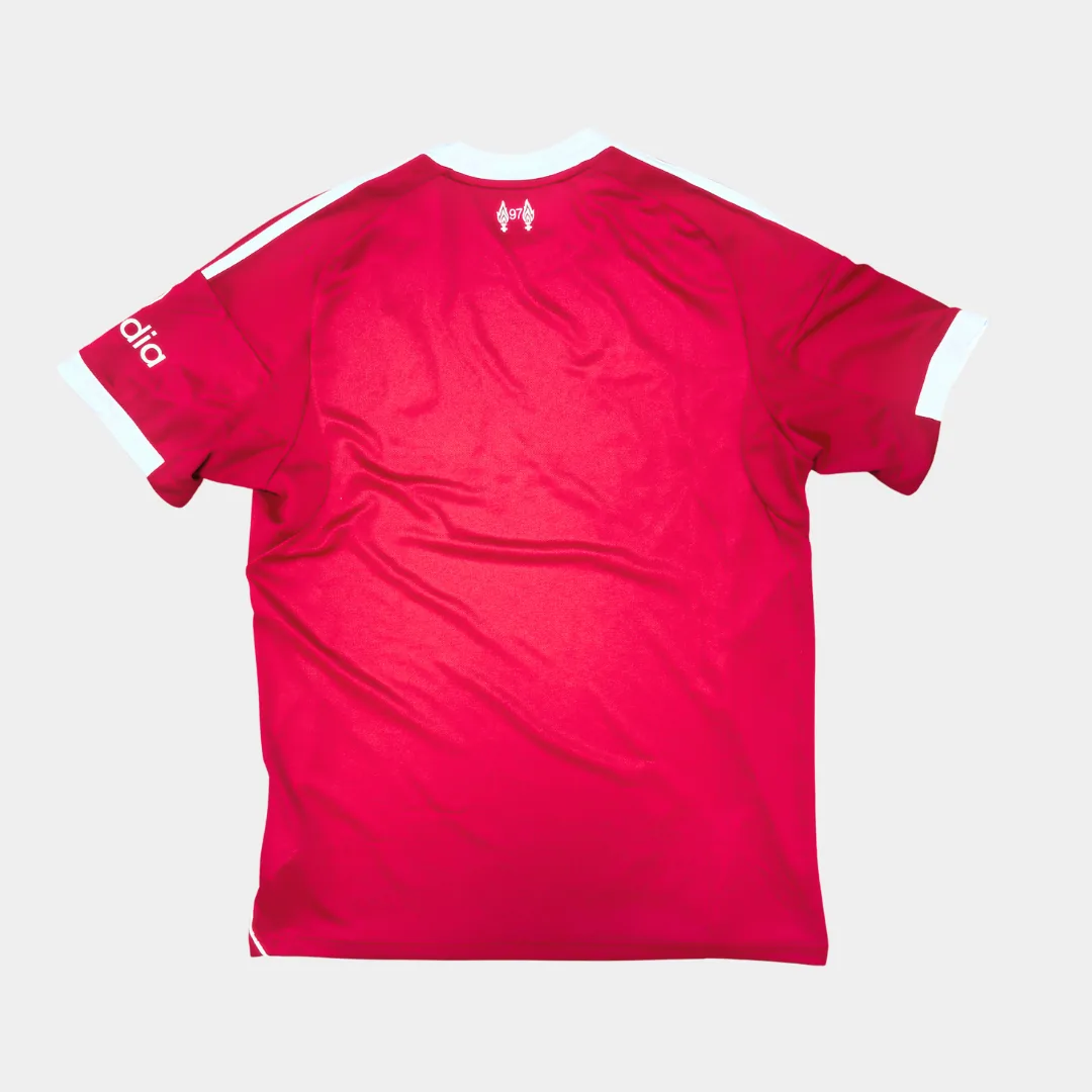 Na froncie znajdują się oficjalne elementy klubowe Liverpool FC, logo producenta oraz sponsor. Całość wykonana jest z lekkiego, oddychającego materiału, który zapewnia komfort noszenia na co dzień oraz podczas aktywności sportowej.